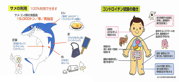 サメ軟骨とは中華の三大高級食材で名高いフカヒレのこと、といったほうがわかりやすいかもしれません。不老長寿の料理として中国の上流層に珍重され、清の西太后が死ぬまで若々しくエネルギッシュだったのも、毎日フカヒレスープを飲んでいたからだといわれます。 成分および特性:深海鮫肝油の性状および特性は、90%がスクアレンにより構成され、残りの10%に油脂(トリグリセライド)およびスクアレンの1/2の構造を有するプリスタン、その他を含みます。スクアレンは分子式C30H50、6個の2重結合を有する化合物で、その化学構造はビタミンA(レチノイド)、ビタミンE(α、β、γ、δトコフェロール)と同 効能効果:スクアレンは生体内では酢酸よりメバロン酸を経て生合成される。これは内因性スクアレンと称する。さらにスクアレンからコレステロールを経てステロイド・ホルモンの性ホルモン系(プロゲステロン、アンドロゲン、エストロゲンなどのステロイド・ホルモン)、副腎皮質ホルモン系(コーチゾン)、糖コルチコイド、電解質コルチコイド等のコルチコイド系、活性ビタミンD3等が生合成される。スクアレンはコレステロールの量をコントロールして調整していますし、肝疾患の経過においてコレステロールと異なった血中スクアレン濃度の変動がみられることは、スクアレンが生体に必要な物質であることを示し、それらのことから更に注目されています。急性肝炎、肝硬変ではコレステロール濃度の低下がみられることが多く、肝疾患にスクアレン補給して、GPTのわずかな低下傾向がみられています。易疲労感などの自覚症状は改善傾向も認められました。また、「スクアレン」の特質としては、酸素と結合し易く、酸素を体内に補給して、細胞内に酸素をはこぶ作用があり、新陳代謝促進、発ガンの抑制効果、細胞復活、免疫力強化、殺菌作用、鎮痛作用、解毒作用、抗酸化作用、浸透作用などに様々な効果が報告されていました。 |